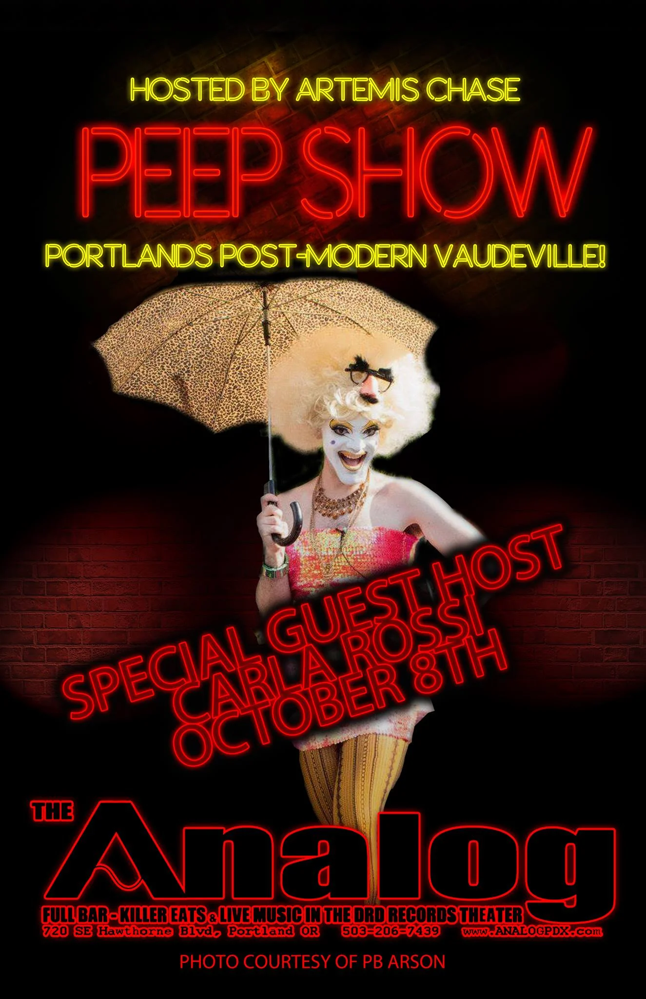 This month brace yourselves for a very special edition of Peep Show as Carla Rossi takes over as hostess while Artemis is off to South America once again for "dental work".